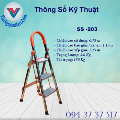 Bảng thông số kỹ thuật Thang Nhôm Ghế Tay Vịn Inox Kagami SS -203 Nhật Bản
