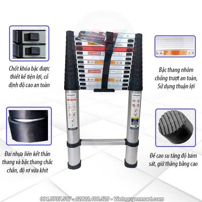 - Thân thang có thiết kế ống tròn cứng cáp và tiện lợi, di chuyển linh động, hiệu quả nhanh. Cấu tạo đoạn liên kết đoạn theo dạng thang trong thang, nên thu gọn lại dễ dàng, không mất nhiều diện tích.