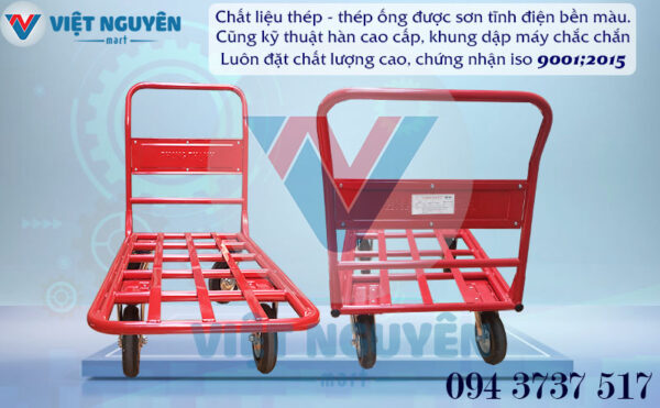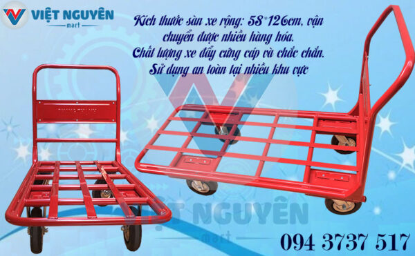 - Thiết kế mặt sàn chất liệu thép – thép ống, được sơn mạ tĩnh điện bền màu. Xe Phong Thạnh với màu đỏ đặc trưng, dễ nhận diện, thích hợp với không gian kho bãi, nhiều hàng hóa.