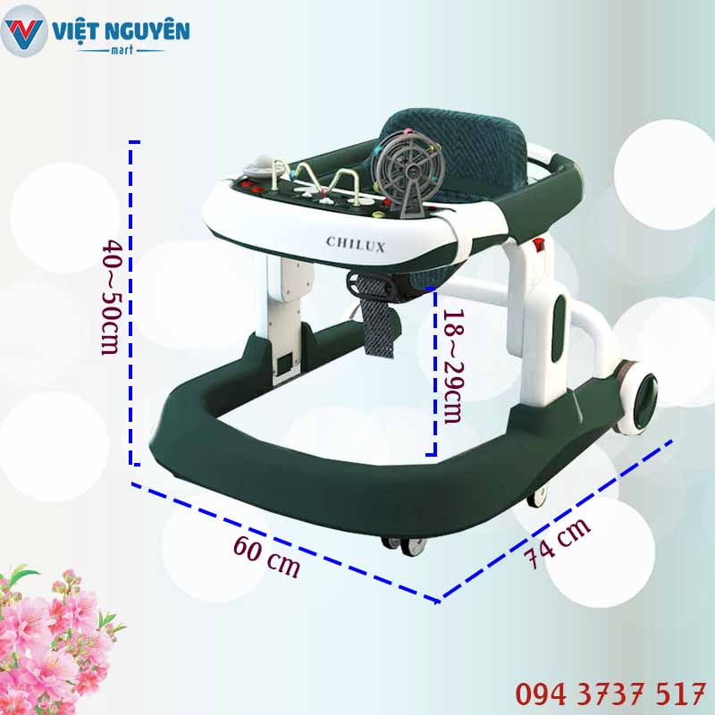 - 1.2 Kích thước sử dụng xe tập đi cho bé Chilux Walks xanh rêu chính hãng